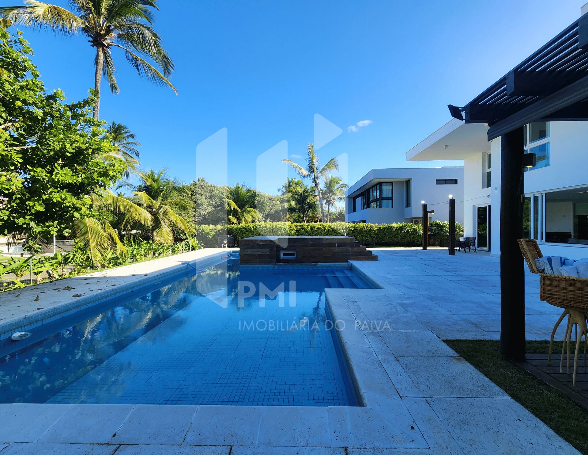 . Piscina ampla integrada ao jardim e à varanda